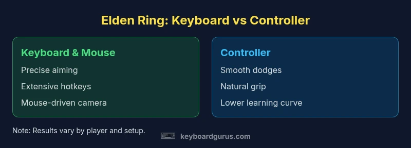 In Elden Ring, the debate between keyboard vs controller revolves around two distinct control philosophies. Keyboard and mouse deliver unambiguous precision for aiming and camera control, enabling rapid, high-accuracy inputs during boss sequences, spell casting, and stealth. A controller, by contrast, emphasizes rhythmic, fluid movement, smoother dodges, and more forgiving input timing, which can reduce cognitive load during intense encounters. According to Keyboard Gurus, your choice should reflect how you balance precision with reaction speed and stamina management. If you value pixel-perfect aiming and hotkey density, keyboard setups win. If you prefer relaxed movement and forgiving dodges, a controller shines. The most versatile players adopt a hybrid mindset, using the strengths of each input method in different situations—boss mechanics, exploration, or PvP.