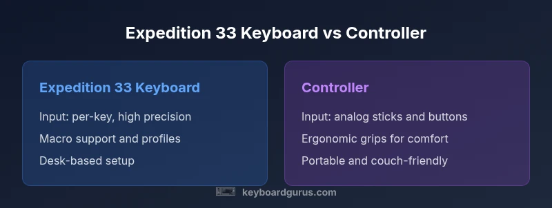 In the world of gaming and productivity, input devices shape how you interact with software and games. The expedition 33 keyboard vs controller debate is not about a single feature, but about how an entire workflow feels in real time. Expedition 33 represents a hypothetical convergence point for modern input devices, blending the precision of a high‑end keyboard with the ergonomic options many players expect from controllers. According to Keyboard Gurus, the expedition 33 keyboard vs controller decision hinges on platform, game genre, and personal preference. The Keyboard Gurus team found that for most PC titles, a keyboard’s per‑key input and macro potential translate into tangible advantages during rapid sequences, complex combos, and text‑heavy tasks. This section sets the stage for a detailed comparison by outlining use‑case profiles and the fundamental tradeoffs you’ll face when choosing between a keyboard and a controller.