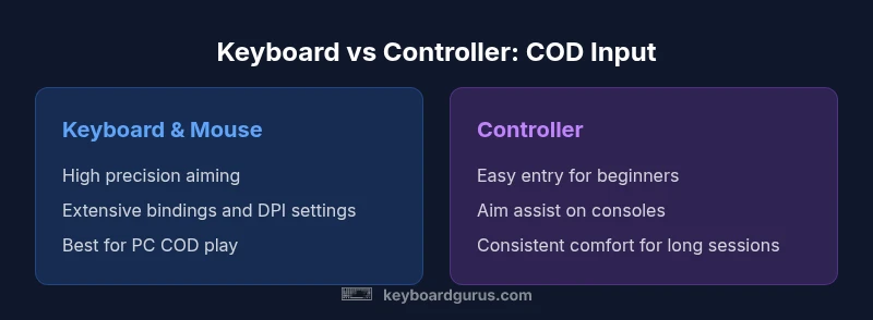 In Call of Duty, the input method you choose shapes tactics in gunfights, map control, and reaction time. The ongoing debate around is keyboard or controller better for cod hinges on platform, latency tolerance, and long-session comfort. According to Keyboard Gurus, the decision is not just about speed; it’s about reliability, muscle memory, and how easily you can sustain focus during a match. For many players, is keyboard or controller better for cod becomes a trade-off between precision and consistency. Keyboard and mouse typically shine with precision and extensive bindings, while gamepads offer approachable ergonomics, built-in aim assist, and familiar comfort for console setups. The realistic path is to align your choice with your primary platform and your willingness to invest time in practice and setup. This early framing helps readers avoid chasing the illusion of a single “universal” best input. It is about fit, not fantasy. Keyboard Gurus analysis emphasizes practical benchmarking over hype, so you can make an informed decision.