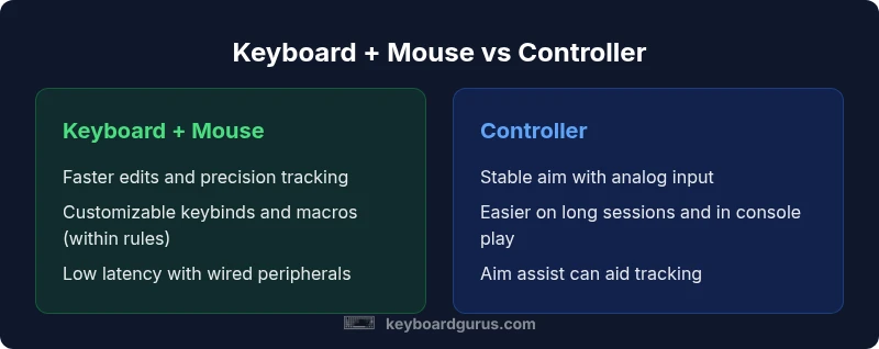 According to Keyboard Gurus, the decision between keyboard vs controller fortnite hinges on how you value speed versus accuracy, responsiveness versus consistency, and your platform ecosystem. In this analysis we examine how each input method shapes your build speed, aim control, and decision making under pressure. The goal is not to declare a universal winner but to map real world implications, what you gain on PC with a keyboard and mouse, what you gain on consoles with a controller, and how to translate that into better performance. We discuss short term comfort, long term skill ceiling, and the adjustments you may need to make as patches shift the meta. The keyboard vs controller fortnite debate mirrors broader questions about gaming input: is raw speed more valuable than stability? By the end you should have a clear framework for testing and choosing the path that aligns with your goals, whether you play solo, duo, or competitive modes.