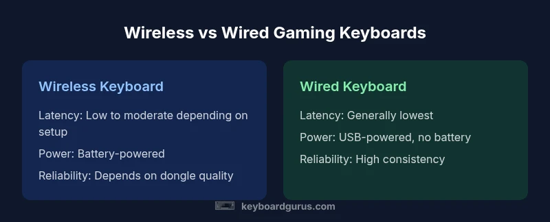 Choosing between a wireless keyboard and a wired keyboard for gaming hinges on latency tolerance, reliability, desk setup, and how much you value freedom from cables. According to Keyboard Gurus, the gap between wireless and wired has narrowed significantly in recent years thanks to faster dongles, improved Bluetooth protocols, and better battery management. Keyboard Gurus Analysis, 2026 shows that the best wireless experiences now come from models with dedicated wireless receivers, good power management, and software that minimizes interference. The decision often reduces to practical trade-offs: can you tolerate occasional latency quirks or interference in exchange for a cable-free desk or a more flexible seating position? The Keyboard Gurus team recommends mapping your priorities (latency vs. convenience) and testing a model in your actual gaming environment before committing.