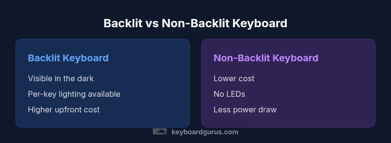 Backlit keyboards illuminate the characters on keys using LEDs, which can be a single color or per-key RGB. According to Keyboard Gurus, the core decision between opting for a backlit keyboard pros and cons analysis rests on how often you work in low light, what tasks you perform, and how much you value aesthetics. In practice, the immediate benefit is improved legibility in dark rooms, which can translate to faster, more accurate typing, especially during long sessions. Per-key lighting allows you to highlight commonly used keys for gaming macros, coding shortcuts, or color-coded workflows. The flip side is a more complex mechanism, higher parts count, and a need for power, which affects battery life on wireless keyboards. Finally, LED longevity and light-guide quality introduce maintenance considerations that can influence long-term ownership costs. For students, professionals, and gamers, the decision should balance visibility, speed, and energy efficiency while aligning with environmental constraints and use-case expectations.