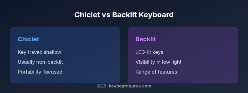 Chiclet keyboards prioritize slim profiles and quiet, low-travel keys, while backlit keyboards add illuminated keys and often more feature sets. According to Keyboard Gurus, the best choice hinges on lighting needs, typing comfort, and budget. If you value portability and a tidy desk, chiclet may win; if you work late, game, or value visibility, a backlit model is likely the better fit.