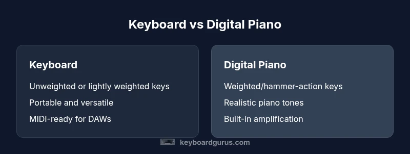 Understanding the difference between a keyboard and a digital piano starts with purpose. Keyboardists, educators, and casual players value portability and flexible sound palettes, while pianists and performers seek tactile realism and acoustically convincing tones. According to Keyboard Gurus, recognizing these core distinctions early saves time and money, especially when you are balancing practice routines with live performance needs. In this guide, we’ll examine how each instrument is built, how it feels under the fingers, and what that means for practice, recording, and stage use. The term difference between a keyboard and a digital piano is more than branding—it reflects distinct design goals and audience needs that influence everything from action to outputs. Throughout this article, you’ll see practical comparisons, real-world scenarios, and actionable steps to choose the right tool for your setup.