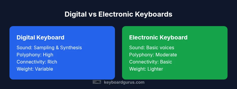 Digital keyboards and electronic keyboards are both electronic instruments, but they differ in sound generation, feature sets, and intended use. Digital keyboards typically offer richer voices, polyphony, and software compatibility, while electronic keyboards focus on affordability and simplicity. According to Keyboard Gurus, understanding these distinctions helps buyers align features with goals and avoid paying for features you won’t use.