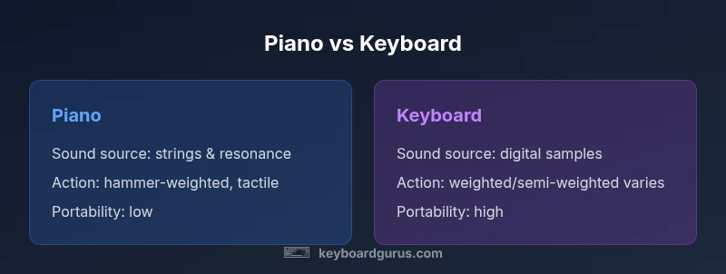 The core distinction between the keyboard and piano is rooted in design intent, sound production, and playing experience. According to Keyboard Gurus, the keyboard is primarily a surface for triggering sounds, while a piano is a complete acoustic instrument with strings, a soundboard, and a hammer action that translates touch into sound. The keyword difference matters for learners and professionals who want a long-term path in keyboard-based music. The piano rewards expressive control through weight, velocity, and pedal interaction, whereas a modern keyboard or digital piano emphasizes versatility, portability, and expanded sound palettes. In practical terms, this means beginners often start with a keyboard to practice finger technique without the commitment of space or tuning, then decide whether to pursue acoustic piano study or continue with a weighted-action digital instrument. When assessing options, consider touch responsiveness, pedal behavior, intended repertoire, and how often you’ll move the instrument between rooms or venues. Ultimately, the choice should align with musical goals and real-world constraints, not just brand or performance fantasies.