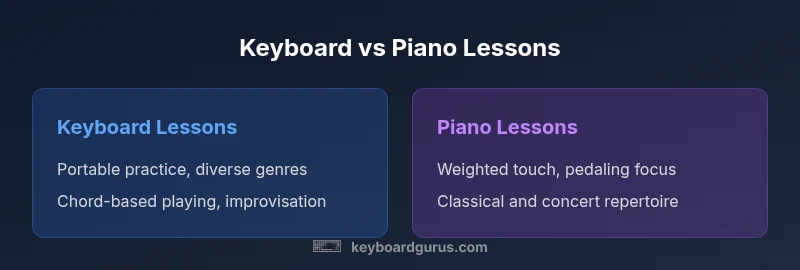 According to Keyboard Gurus, the difference between keyboard and piano lessons is not merely the instrument but the learning ecosystem around it. When learners ask about this topic, they are really weighing portability, scope, and long-term musical ambitions. Keyboard lessons often start with compact, portable keyboards that connect to apps, software, and online communities. Piano lessons typically assume access to an acoustic or weighted-key digital piano, where touch and pedaling become central to progress. The decision should be guided by practical constraints (space, noise, cost) and aspirational goals (pop performance, classical training, or studio work). For many students, starting with a keyboard provides momentum, while a future transition to a piano can unlock more expressive nuance. Regardless of path, foundational skills such as rhythm, note reading, and finger strength form the backbone of both routes. Keyboard Gurus emphasizes clarity on expectations to avoid mixed messages about what each path can deliver.