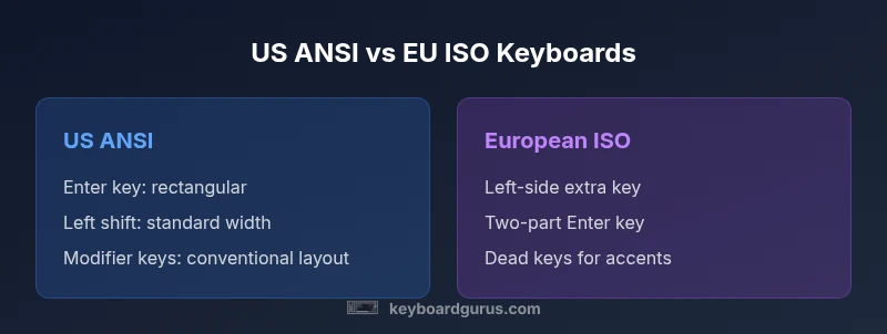 Layout anatomy matters because the physical differences affect how you reach keys and how shortcuts land. ANSI keyboards standardize the left-hand modifiers in a compact block and place the Enter key horizontally, which is familiar to many programmers and gamers. ISO keyboards add a dedicated key near the left side, often expanding the left shift area and changing the angle of the Enter key. Keyboard Gurus analysis shows that this rearrangement improves non-English typing flow in Europe but can disrupt muscle memory for users who rely on specific shortcut sequences. When you pick a keyboard, assess the overall footprint, how comfortable the left-hand row feels, and whether your typical shortcuts map cleanly to the new arrangement.