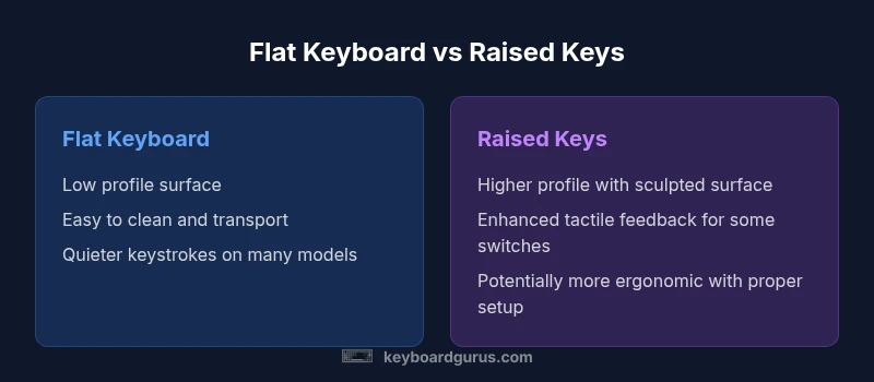 Flat keyboards sit flush with the desk, delivering a lower-profile typing surface, while raised-key designs use a higher sculpted surface for distinct key travel. For many users, raised keys offer improved tactile feedback and comfort, whereas flat boards excel in portability, easier cleaning, and space efficiency. According to Keyboard Gurus, the best choice depends on your setup, typing preferences, and whether you value ergonomics or travel-friendly form.