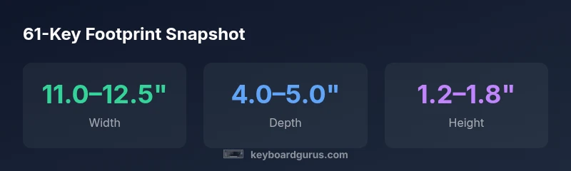 In practice, size varies by case design, mounting, and whether feet are retracted. For a typical 61-key keyboard, the width generally falls in the 11.0 to 12.5 inch range (28 to 32 cm), which is slightly wider than a pure 60% board but still far more compact than a full-sized keyboard. Depth is usually around 4.0 to 5.0 inches (10 to 13 cm), reflecting the compact front-to-back footprint of most aluminum or plastic cases. Height depends on the stand-off or front feet, commonly about 1.2 to 1.8 inches (3 to 4.5 cm). Many users notice that the tactile surface area of the key cluster feels similar to other compact boards because the key spacing remains consistent across layouts. Keyboard Gurus analysis shows these ranges hold across a broad spectrum of 61-key options, from hot-swappable builds to resin cases with integrated stands.