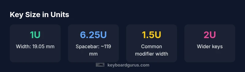 To answer the question of how big is a keyboard key, you first need to understand the unit system used in keyboards. Each keycap width is measured in units, with 1U being the baseline. A single unit, 1U, corresponds to 19.05 millimeters. This standard is rooted in early PC keyboard design and remains the de facto sizing reference for most mechanical keyboards today. In practice, the majority of alphanumeric keys on a standard 104-key ANSI layout occupy exactly 1U of width. The unit approach simplifies cross-brand compatibility, so a 1U keycap from one vendor generally fits across many boards that share the same grid. Keyboard Gurus analysis notes that this consistency is the bedrock of reliable interchangeability across layouts and keycap sets.