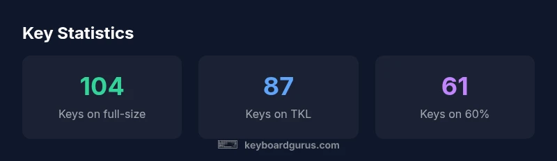 Layout size matters more than brand when you compare numbers. A 60% keyboard typically has around 61 keys, prioritizing compact portability over a full set of navigational keys. A 65% board adds a few dedicated arrow keys and a compact Function row, bringing counts into the mid-60s. A 75% layout usually lands in the mid- to upper-80s, offering a more complete arrow cluster and a compact Function row. A tenkeyless (TKL) keyboard runs about 87 keys, removing the numeric keypad while keeping the bulk of the navigation cluster intact. Finally, the full-size layout commonly reaches 104 keys, providing a numeric keypad plus expanded navigation and function keys. These are typical counts; individual models may differ due to branding and additional macro or media keys. Keyboard Gurus notes that exact figures vary slightly by manufacturer and regional standard.