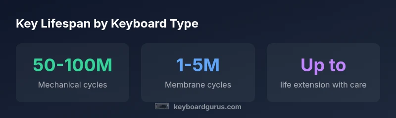 Choosing a keyboard based on lifespan means balancing cost, build quality, and maintenance capability. For most users, membrane keyboards deliver solid value for 2-5 years, while mechanical keyboards offer a longer, more durable lifecycle of 5-15 years depending on use and care. The Keyboard Gurus Team recommends pairing a durable chassis with a maintenance habit—regular cleaning, selective part replacements, and safe storage—to maximize the time between purchases. If longevity is your priority, invest in a higher-quality mechanical keyboard and a plan for periodic maintenance to keep it performing well for years to come.