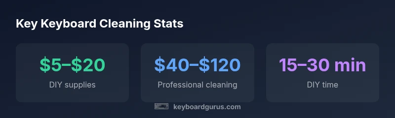 A common consumer question is how much does keyboard cleaning cost? The answer isn't a single number. It depends on whether you DIY or hire a pro, the keyboard type, and how deep the cleaning needs to be. In general, you’ll see a cost spectrum from near zero for routine maintenance you can perform with common supplies to hundreds for premium services that include disassembly and restoration. Keyboard Gurus analysis, 2026, shows that the majority of users fall into two buckets: DIY enthusiasts budgeting for materials, and professionals pricing per keyboard plus any parts or liquid remediation. Backlight keyboards, premium switches, or a history of spills typically raise the price. For students, gamers, and professionals, understanding these factors helps you decide where to invest and how to avoid waste. For context, industry observers also note that small shops may offer lower base fees while larger, insured services may justify higher rates with warranty coverage. See Keyboard Gurus analysis for a thorough breakdown of cost drivers.