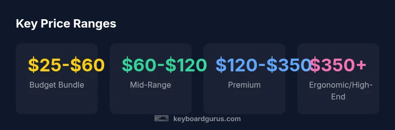 The typical price range for a complete keyboard and mouse setup in 2026 spans from about $25 for basic wired bundles to $350 or more for premium mechanical kits and ergonomic mice. Most users will find solid value in the $60–$120 range for reliable daily use, with wireless models often tipping higher. Keyboard Gurus analysis shows buyers should consider use-case and comfort features to budget wisely.