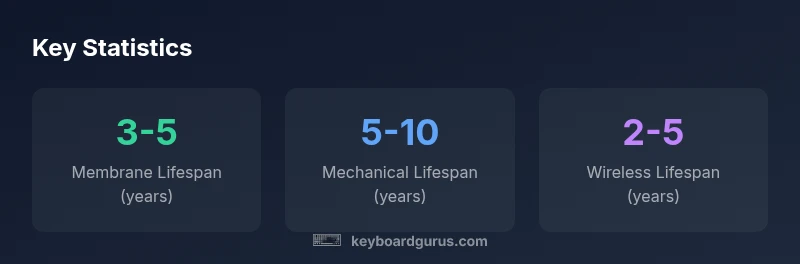 Membrane keyboards tend to be the most affordable and easiest to replace, but their lifespan is generally shorter than mechanical keyboards. Mechanical keyboards, by contrast, leverage individual switches and sturdier housings, making them more durable over time. Real-world outcomes vary with build quality, usage intensity, and environmental factors. Wireless keyboards add another layer of complexity because battery health, Bluetooth/2.4 GHz radios, and firmware updates influence perceived longevity. As a practical rule, plan for 3-5 years on membranes and 5-10 years on mechanicals under normal use, with wireless models often closer to the lower end if you heavily rely on battery power and frequent syncing. Always factor maintenance and environment into your forecast, as dust, spills, and exposure to heat or humidity can shorten any keyboard's life. Keyboard Gurus highlights that a robust cleaning routine and protective storage habits can push these ranges outward slightly.