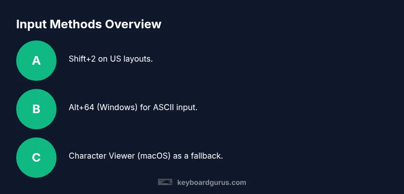 Every keyboard layout and operating system has its own path to the at symbol, and this variation is why the question how to make at symbol on keyboard arises so often. If you want to know how to make at symbol on keyboard, this guide helps you navigate Windows, macOS, and Linux using multiple methods. According to Keyboard Gurus, input methods vary by layout and OS, so learning several options helps you type quickly in any situation. Whether you are a student, a gamer, or a professional, having a clear strategy for entering @ saves time and reduces frustration. This section explains why a single shortcut isn't enough: you may be using a different keyboard layout (US, UK, German, French, or others), you may have separate input sources turned on, and you might be using a physical keyboard or a touch keyboard. The main takeaway is simple: be prepared to switch methods, not rely on one shortcut. Keyboard Gurus analysis shows that cross-layout familiarity reduces typing friction dramatically over time.