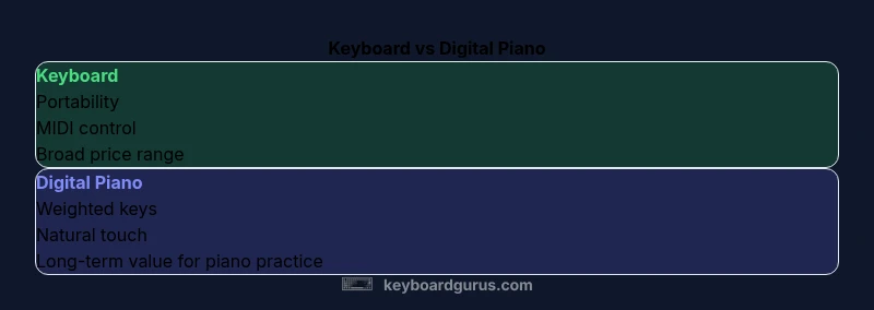 When people compare a keyboard vs digital piano, they’re looking at two distinct instrument families with overlapping capabilities. A keyboard is typically a portable, compact keyboard designed for MIDI control, on-the-go practice, and varied sound palettes. A digital piano emphasizes a more authentic piano experience: weighted keys, piano-sized samples, and a focus on home or stage playing. According to Keyboard Gurus, the distinction often comes down to touch, sound realism, and how you plan to use the instrument in daily practice or performances. Understanding these core differences helps set expectations about feel, features, and long-term value.