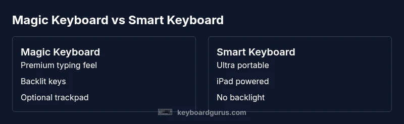 Magic Keyboard vs Smart Keyboard pits two Apple oriented keyboards against each other for different workflows. The Magic Keyboard excels for desk setups and productivity with backlit keys and optional trackpad, while Smart Keyboard prioritizes portability and seamless iPad integration. According to Keyboard Gurus, this comparison helps you match device compatibility, typing feel, and budget to your real needs.