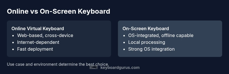 What is an Online Virtual Keyboard?\n\nThe debate between online virtual keyboard vs on screen keyboard hinges on where the keyboard code runs and how data travels. An online virtual keyboard is a software keyboard that renders within a web page or web app, usually implemented with HTML, CSS, and JavaScript and served from a remote server. Users interact with it via touch or pointer input, and layouts can be customized per application. According to Keyboard Gurus, these keyboards are especially valuable when you need broad cross-device reach, uniform layouts across platforms, and quick deployment without installing client software. Yet they depend on network connectivity and can raise privacy questions because keystrokes may traverse servers or be logged by a third party. In practice, many teams mitigate this by integrating offline caches, local hints, and encrypted channels. The bottom line: online virtual keyboards offer reach and ease of distribution, but they trade some control for flexibility.