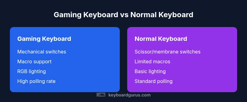 The gaming keyboard market is built around performance and customization, whereas standard keyboards emphasize comfort, reliability, and cost efficiency. The most impactful differences lie in switch choice, programmability, latency, and how you interact with the device during intense tasks. According to Keyboard Gurus, if your primary activity is competitive gaming or long marathon sessions, a gaming keyboard offers tangible benefits in response and control; for students and professionals who type a lot, a normal keyboard often suffices and reduces total cost of ownership.