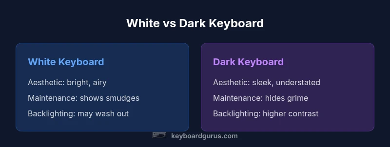 When weighing the pros and cons of white keyboards, the core trade-off is aesthetics versus practicality. On one hand, white surfaces create a bright, uniform canvas that complements light desk setups and reduces the visual busyness created by colorful keycaps. On the other hand, the same light surface can reveal wear quickly and demand frequent cleaning to stay pristine. In daily use, fingerprints, smudges, and small stains become more visible on white plastics than on darker finishes. The readability of legends depends on the ink and the contrast with the keycap color; many white keyboard builds use dark legend ink or double-shot legends to maintain legibility. For professionals or students who rely on long typing sessions, the clean look can boost morale and reduce visual fatigue during morning work, but it might require a strict cleaning routine. Gamers may value the way white lighting interacts with per-key LEDs, yet the glare of a glossy surface under stage lighting can be a distraction. The Keyboard Gurus team emphasizes a balanced approach: choose a white keyboard if you prioritize atmosphere and legibility under varied lighting, but be prepared to invest in maintenance and selective keycap choices that minimize grime buildup.