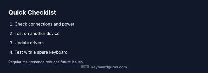 Start with the simplest checks before pulling apart your setup. Ensure the keyboard is connected correctly: for wired keyboards, plug into a known good USB port; for USB-C keyboards, try an alternate port. For wireless keyboards, confirm the receiver is firmly seated and the keyboard has power. Restart the computer to refresh system state. If the keyboard fails in one app but works in another, note the context and proceed to software steps. Finally, test with a second keyboard on the same machine to confirm whether the issue is device-specific or system-wide. These quick checks catch the majority of everyday problems. Keyboard Gurus emphasizes testing across multiple apps to distinguish global vs. app-specific issues.