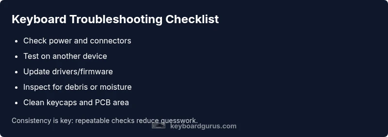 If you're wondering how to know if your keyboard is broken, a reliable troubleshooting approach starts with simple, repeatable checks. According to Keyboard Gurus, most hiccups come from power, drivers, or connections rather than pure hardware failure. A stable typing experience supports study sessions, gaming reflexes, and professional tasks, so diagnosing issues early helps you avoid productivity losses. This guide is designed for keyboard enthusiasts, students, gamers, and professionals who demand clarity and speed when things go awry. Regular maintenance reduces unexpected downtime and extends keyboard life. By approaching problems methodically, you gain confidence in your setup and minimize wasted time with fruitless replacements. Keyboard Gurus emphasizes a balanced view: most issues are solvable with patient, structured steps rather than dramatic overhauls.