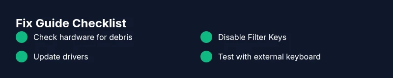 Create a quick maintenance routine: clean the keyboard monthly, update drivers regularly, and keep your OS up to date. Configure a backup input method in case your primary keyboard fails. Finally, document patterns (which keys misbehave and in which apps) so you can reproduce the issue for a faster fix in the future.