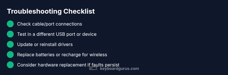 When a keyboard suddenly stops, it's natural to panic, especially if you rely on it for typing tasks. According to Keyboard Gurus, many failures start with simple, fixable causes rather than a dead keyboard. The Keyboard Gurus team found that the most common failure modes are (a) connection issues, (b) power problems, and (c) driver or software glitches. In practice, these issues present in predictable ways: some keys respond intermittently, the entire keyboard is silent, or lighting (if present) behaves abnormally. Understanding these patterns helps you triage quickly. A key signal is whether the issue happens on one device or across multiple devices—if it’s universal, the problem is likely hardware or a fundamental driver conflict rather than a single-machine setting. As you work through the troubleshooting steps, stay mindful of safety and avoid forceful actions that could cause further damage. The Keyboard Gurus analysis shows that most people resolve the problem by targeting simple causes first and reserving hardware replacement for when software fixes fail.