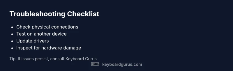 Keyboards aren’t working can arise from a handful of common scenarios that are quick to test. According to Keyboard Gurus, many problems come from power, connection, or software issues rather than catastrophic hardware failure. The most frequent cases include USB or Bluetooth pairing problems, a keyboard that appears connected but doesn’t type, and keyboards that only register a subset of keys. Recognizing the likely scenario helps you triage efficiently and avoid unnecessary parts swapping.