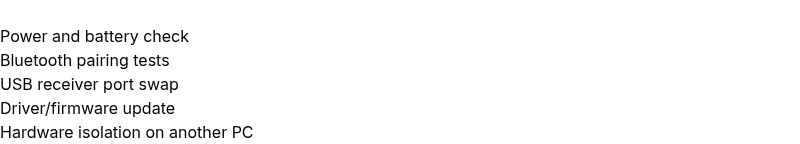 Begin with power and connection checks: replace batteries, reconnect USB receiver, or re-pair Bluetooth. If it still fails, proceed to driver and firmware updates.