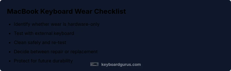 A worn MacBook keyboard is usually a hardware issue from wear or debris. Start with quick checks: unplug peripherals, clean the keyboard safely, and test with an external keyboard to confirm if the issue is hardware. If problems persist, pursue repair or replacement options.