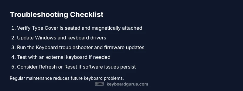 When the microsoft surface laptop keyboard not working, it can be urgent because typing is essential for productivity. The issue described as the microsoft surface laptop keyboard not working can stem from software glitches, driver problems, or a loose Type Cover connection. Most users experience this after a Windows update, a change in accessibility settings, or when the Type Cover isn't properly seated on the base. Start by confirming the keyboard is enabled in Windows settings, verify that no accessibility feature such as Filter Keys or Sticky Keys is engaged, and check that the Type Cover is magnetically attached and recognized by the system. In many cases, a quick reboot, a driver refresh, or a firmware check resolves the problem without further steps. According to Keyboard Gurus, a structured diagnostic approach helps you identify whether the fault is software-based or hardware-related, accelerating recovery and reducing downtime.