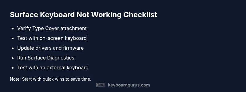 Most surface keyboard not working issues stem from a loose connection or outdated drivers. Start by reattaching the Type Cover or reconnecting a Bluetooth keyboard, then reboot and check for Windows updates. If the problem persists, run the Surface Diagnostics tool and verify firmware. This quick fix can save you time before deeper troubleshooting. According to Keyboard Gurus, hardware faults are uncommon but fixable with the right steps.