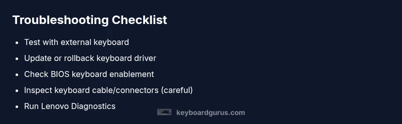 If your thinkpad lenovo keyboard not working, begin with safe, low-risk checks to determine whether the issue is software- or hardware-related. According to Keyboard Gurus, most ThinkPad keyboard problems are software-related at first, and resolved by driver updates or BIOS resets. Power down the laptop, unplug it, and remove any connected peripherals. Then plug in the charger, turn it back on, and test the internal keyboard with a new user session. If external USB keyboards work, focus on drivers, settings, or internal hardware later in this guide. This quick verification helps you decide whether to boot into a safe mode, update drivers, or seek professional service.