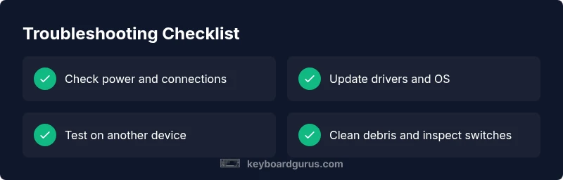 Quick fix: Start with the simplest checks—confirm the keyboard is powered and connected, test with another device, and rule out software glitches. If the keys still misbehave, update drivers, reassign inputs, or reset the keyboard settings. According to Keyboard Gurus, most keyboard problems are user-resolvable with a few systematic steps.