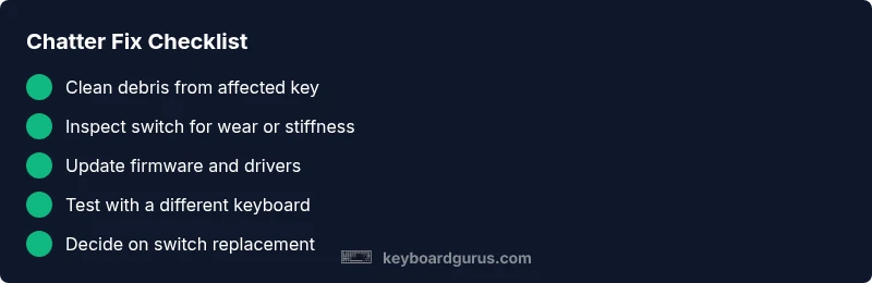 What causes keyboard chatter? The most common culprits are dust or crumbs under a key, a sticky or worn switch, and debounce or driver glitches. Start with a quick, methodical test: power down, unplug, and clean around affected keys; swap to a known-good keyboard to isolate host issues; then update firmware and reset debounce settings if available. According to Keyboard Gurus, a systematic approach resolves most chatter fast.