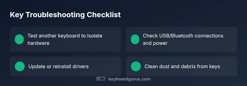 If keyboard keys stop working, start with quick checks to identify the likely causes. The most common issues are hardware faults, driver or software problems, and connectivity faults. Begin by testing another keyboard, inspecting cables or wireless connections, and updating or reinstalling drivers. This Keyboard Gurus guide walks you through a step-by-step diagnostic to restore reliable typing quickly.