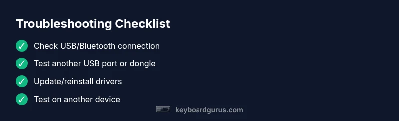 When you first notice that your keyboard isn’t registering input, the clock is ticking. What to do first matters a lot, and in many cases, you can recover full typing ability without replacing hardware. What if keyboard doesn't work? That exact question guides a structured approach: start with quick, reversible fixes, then methodically verify power, connectivity, drivers, and software conflicts. According to Keyboard Gurus, most failures are caused by simple connection or power issues, not a dead keyboard. Begin with non-destructive checks that you can undo at any time and progress to more involved steps if needed. This initial triage sets the stage for a faster resolution and reduces unnecessary downtime.