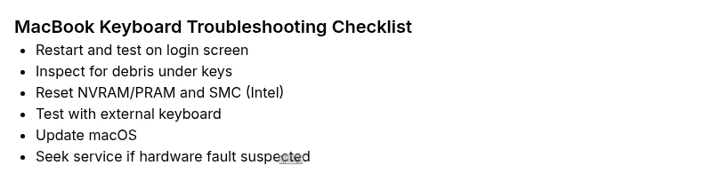 If basic software fixes do not restore keyboard function, or if Apple Diagnostics indicates hardware failure, contact an authorized service provider for assessment and possible keyboard replacement.