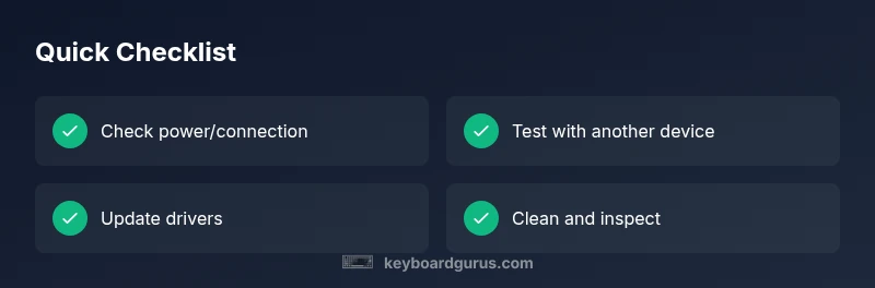 When the keyboard won’t type, the root cause is usually either hardware (a loose cable, a dead key, dust-covered switches) or software (driver conflicts, wrong keyboard layout, or accessibility features). According to Keyboard Gurus, most typing problems originate from simple hardware connections or software settings rather than catastrophic failures. Start with a quick mental map: can you type in a different app or on another device? If yes, focus on software/configuration; if no, focus on the keyboard hardware. This distinction guides every following step and saves time during urgent troubleshooting.