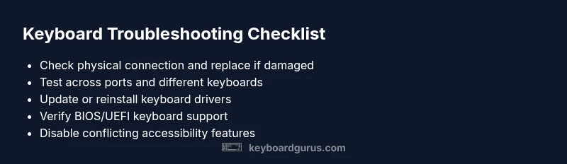 When a keyboard stops responding on a PC, the first question is often: what to do when keyboard is not working in pc? The fastest way to regain control is a structured approach that separates hardware faults from software glitches. Most issues originate from loose connections, bad ports, driver conflicts, or settings that disable input devices unintentionally. By thinking in layers—hardware, drivers, and operating system—you can systematically rule out each cause without replacing components prematurely. According to Keyboard Gurus, starting with the simplest checks yields the highest return on time spent. In practice, begin with a visual and physical check, then move to software tests, and only then consider deeper reconfigurations such as BIOS or reinstalling drivers. This method keeps you in command and reduces guesswork during urgent moments like a deadline or gaming session. In this guide, you’ll find a clear flow, practical checks, and safe fixes you can perform without specialized tools. Remember: safety first, especially when you’re poking around inside a PC or disconnecting peripherals.