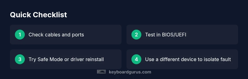 When keyboard and mouse is not working, the first step is to stay calm and work through a simple checklist. In most cases, the root cause is a connection issue, a misconfigured BIOS setting, or a software conflict rather than a dead device. According to Keyboard Gurus, many unresponsive input devices come from loose cables, a faulty USB port, or a keyboard/mouse driver conflict after an update. Start with the basics: reseat the devices, verify power to the computer, and check that USB devices are detected during boot. If USB devices aren’t recognized in BIOS, the problem is more likely hardware- or motherboard-related. Do not rush to replace parts; instead, test one variable at a time. A deliberate, methodical approach saves time and keeps you productive, which is especially important for students and gamers who depend on reliable input for deadlines or wins.
