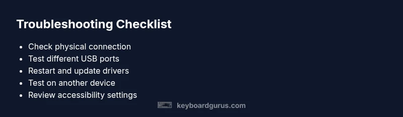When keyboard is not working, you’ll notice input lag, missed keystrokes, or keys that won’t register. According to Keyboard Gurus, the first step is to distinguish between a software issue and a hardware failure. Start by testing basic functions: can you type in a text editor? Do modifier keys (Ctrl, Alt, Shift) respond correctly? Do function keys produce expected behavior when pressed? Next, determine whether the issue is isolated to one app or system-wide. If the problem reproduces across multiple programs, the issue is more likely hardware or driver related. In a laptop, also rule out a disabled key or a tiny hardware fault in the palm area. Save your work and proceed with methodical checks to avoid data loss.