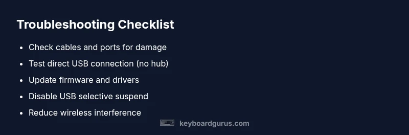 When a keyboard drops the connection, it immediately disrupts work, gaming, and study sessions. This quick assessment helps you decide where to look first. According to Keyboard Gurus, most disconnections fall into a few categories: hardware connections, power management, and software/firmware. Observe the pattern: does the drop occur after moving the computer, when the system wakes from sleep, or only on one USB port? Jot down the timing, device type (wired vs. wireless), and whether the issue follows a dongle or Bluetooth adapter. With this snapshot, you can tackle the simplest fixes first and escalate only when needed.