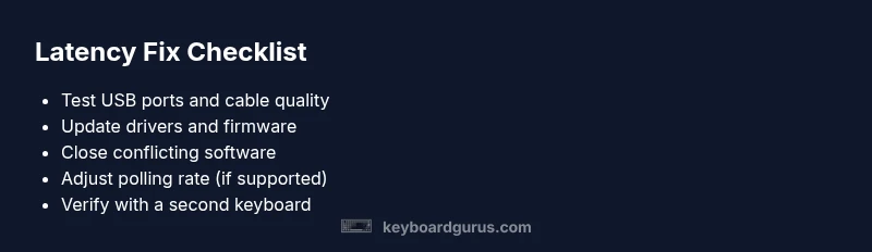 Input delay, or latency, is the time between pressing a key and seeing the corresponding action on screen. For keyboards, this is influenced by hardware architecture (mechanical vs membrane), the polling rate (how often the keyboard reports to the computer), and debounce settings that prevent ghosting or chatter. In practice, most latency problems stem from software or connection issues rather than a single faulty switch. When you troubleshoot, think in terms of three layers: hardware connection, device drivers and firmware, and system software. For gamers, even a few milliseconds can affect performance, so prioritize fixes that shave real-time lag without compromising reliability. In our tests at Keyboard Gurus, most cases resolve within 15 minutes with proper port checks and driver updates. If you notice jitter instead of consistent delay, that points to debounce or USB power constraints rather than a stuck key.