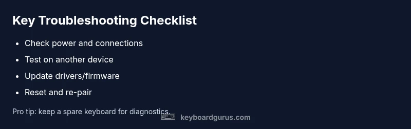 Intermittent keyboard disappearance or abrupt input gaps can hit anyone—students taking notes, gamers in a critical moment, or professionals during a meeting. You might see keys stall, a brief “ghosting” where characters appear late, or the whole keyboard momentarily dropping input while the rest of the system stays active. In practice, the root cause is usually one of a few categories: power supply issues for wireless devices, a loose or damaged wired connection, or a software/driver conflict that surfaces after an OS or app update. According to Keyboard Gurus, the most common culprits are power management settings on wireless keyboards, USB port instability, and mismatched drivers or firmware. Start with basic checks you can do without tools, then move to targeted fixes if the symptom persists. This structured approach helps you isolate whether the problem is hardware, software, or a combination of both.