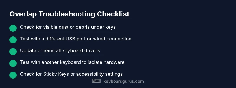 If you’ve ever jotted down that question, you’re not alone. Keyboard overlapping describes a situation where two or more keys register when you press only one, or where certain keys misfire in rapid typing. This isn’t just a nuisance; it can disrupt study sessions, gaming, and professional work. According to Keyboard Gurus, persistent overlap often points to a combination of hardware wear and software settings coming into conflict. The underlying idea is simple: your keyboard should faithfully translate your intent, not create extra characters. By understanding the basics of how keyboards detect presses—whether through mechanical switches or membrane matrices—you can pinpoint what to check first and what to leave for later steps. This guide will walk you through a practical, no-jarred-path approach to restore accurate typing without guesswork.