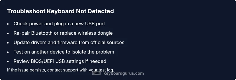 If you're wondering why keyboard is not coming, you're not alone. This issue crops up across Windows, macOS, and Linux, and it can feel urgent because you rely on typing for work, study, or gaming. According to Keyboard Gurus analysis, most detection problems boil down to three broad categories: connection (physical or wireless), software (drivers and firmware), and hardware fault. Understanding which category is involved helps you act fast and avoid unnecessary fixes. In everyday terms, you’re chasing why the system isn’t recognizing a perfectly good input device, and the best first step is to separate the problem by how the keyboard connects to your device.